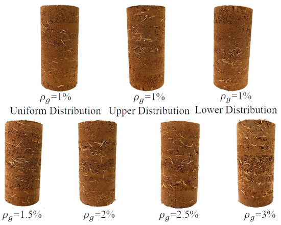 The resonant column specimens were cylindrical, with a diameter of 50 mm and a height of 100 mm. Due to specimen size limitations, Cynodon dactylon roots with a diameter of 0.5–1 mm and a length of 8–10 mm were selected. The specimen soil was dried at 108 °C for 8 h and then prepared with a dry density of 1.65 and a water content of 12%. To thoroughly mix Cynodon dactylon roots with the soil, the soil and roots were evenly divided into five portions by weight, as required by the standard [25]. The mixture was layered into the mold in 20 mm layers, as shown in Figure 4.