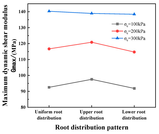 The maximum dynamic shear modulus of soil with different root distribution patterns.