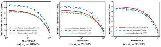Different root distribution patterns in the soil are shown to yield varying maximum dynamic shear moduli and dynamic shear modulus–shear strain curves, as illustrated in Figure 6 and Figure 7. At confining pressures of 100 kPa and 200 kPa, the dynamic shear modulus–shear strain curves for upper root distribution are consistently positioned above those for uniform root distribution and lower root distribution. At a confining pressure of 300 kPa, the dynamic shear moduli for the three root distribution patterns exhibit remarkable similarity. This phenomenon arises from the electromagnetic drive system, which calculates shear modulus by generating sinusoidal torque. When roots are exclusively in the upper section of the specimen, the upper soil shows greater stiffness and strength, resulting in the specimen exhibiting more substantial restorative forces and shorter vibration cycles under dynamic excitation. Consequently, this increases the resonance frequency and dynamic shear modulus. Thus, under lower confining pressures, the upper root distribution pattern is advantageous in enhancing the soil’s dynamic shear modulus. In practice, this aligns with scenarios where roots are mainly distributed at the surface of the embankment in the upper portion of the soil, contributing to an improved soil dynamic shear modulus and reduced dynamic strain amplitudes.