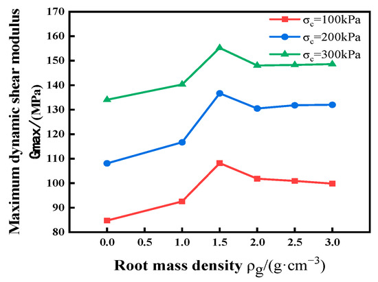 The maximum dynamic shear modulus of soil with different root mass densities.