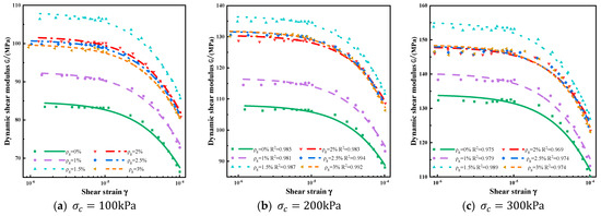 Under the influence of dynamic loading, the dynamic shear modulus is a crucial dynamic parameter characterizing soil behavior. It serves as a key indicator for describing the stress–strain relationship within the soil [30]. In this study, the dynamic shear modulus test results were fitted using the Hardin–Drnevich hyperbolic model. The hyperbolic formula [8] is as follows: