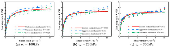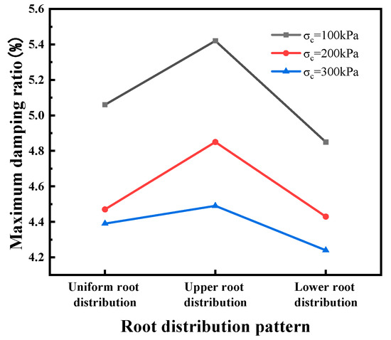 The maximum damping ratio and the damping ratio–shear strain curves for different root distribution patterns are depicted in Figure 11 and Figure 12, respectively. The figures reveal that, under all three confining pressures, the damping ratio of soil with roots distributed in the upper part exceeds that of soil with roots uniformly distributed or distributed in the lower part. This observation can be attributed to the introduction of roots into the soil, enhancing the stiffness of the specimen. Soil with roots in the upper part exhibits greater stiffness in the upper portion and reduced stiffness in the lower section, while soil with roots in the lower part displays diminished stiffness in the upper portion and elevated stiffness in the lower segment. The heightened upper stiffness results in a more rigid and swift response of the vibration system to vibrations, leading to a heightened rate of energy dissipation and, consequently, an increased damping ratio. Conversely, increased lower stiffness yields a softer and slower response of the vibration system, resulting in a comparatively reduced rate of energy dissipation and a diminished damping ratio. Furthermore, soil with roots in the lower part is typically constrained by the upper soil, restricting the transfer of vibrational energy, which contributes to a relatively lower damping ratio. Therefore, placing roots in the upper part of the soil proves advantageous for elevating the soil’s damping ratio and facilitating energy dissipation. This aligns with practical scenarios where roots are predominantly distributed on the surface of embankments, which corresponds to the upper part of the soil and fosters energy dissipation.