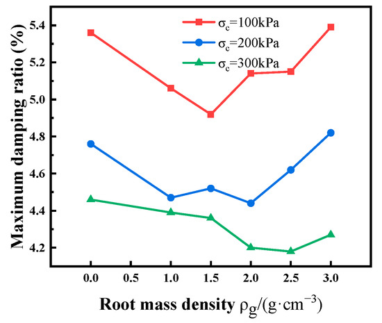 The maximum damping ratio and the damping ratio–shear strain curves for soils with different root mass densities are illustrated in Figure 13 and Figure 14. It is evident from these figures that under a confining pressure of 100 kPa, the maximum damping ratio () was 5.36% when the root mass density was 0. As the root mass density increased to 1.5% , the damping ratio decreased to 4.92%, reaching the minimum critical value. Further increasing the root mass density caused the damping ratio to rise, reaching 5.39% at a root mass density of 3% . Under confining pressures of 200 kPa and 300 kPa, the relationship between the damping ratio and root mass density followed the same trend as under 100 kPa, showing an initial decrease followed by an increase. Specifically, the damping ratio decreased from = 4.76% at = 0 and = 4.46 at = 0 to the minimum critical values of = 4.44% at = 2% and = 4.18% at = 2.5% . When the root mass density reached 3% , the maximum damping ratio increased to 4.8% and 4.27%, respectively. Notably, under 100 kPa and 200 kPa confining pressures, the maximum damping ratio of samples with a 3% root mass density consistently surpasses that of samples with 0% root mass density. This can be attributed to the fact that the inclusion of roots in the samples enhances the soil’s ductility, facilitating energy dissipation and resulting in an elevated damping ratio. Simultaneously, it leads to a denser soil structure, increasing the contact area between soil particles and between soil particles and roots. However, this is not conducive to energy dissipation and results in a lower damping ratio. Simultaneously, it leads to a denser soil structure, increasing the contact area between soil particles and between soil particles and roots. However, this is not conducive to energy dissipation and results in a lower damping ratio. Beyond this point, roots predominantly enhance the soil’s ductility, leading to an increased damping ratio. In summary, the damping ratio initially decreases and then increases with an increase in root mass density. In practical slope scenarios, the growth of plant roots tends to loosen the surface soil, reducing the compactness of the soil on the slope’s surface. Angers DA et al. [39] previously concluded that during the growth process of roots, large pores may form through the soil, but these pores are local and beneficial. While roots enhance the soil’s ductility, their effect on reducing soil compaction is favorable for energy dissipation.