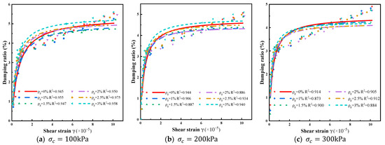 In this study, the relationship between damping ratio and shear strain was fitted using the Hardin–Drnevich hyperbolic model. The hyperbolic formula [8] is as follows: