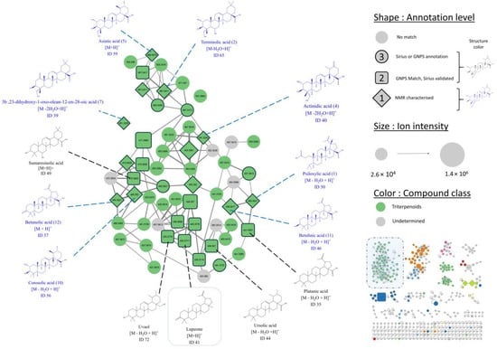 The annotation results provided by Sirius combined with the GNPS spectral databases matches, and NMR structural elucidation of purified compounds were investigated in the context of the IIMN. This approach allowed the expansion of the annotation coverage and identified triterpenoids and flavonoids in their free, methylated, or glycosylated forms as the main classes of compounds of the P. mauritianum ethyl acetate extract.