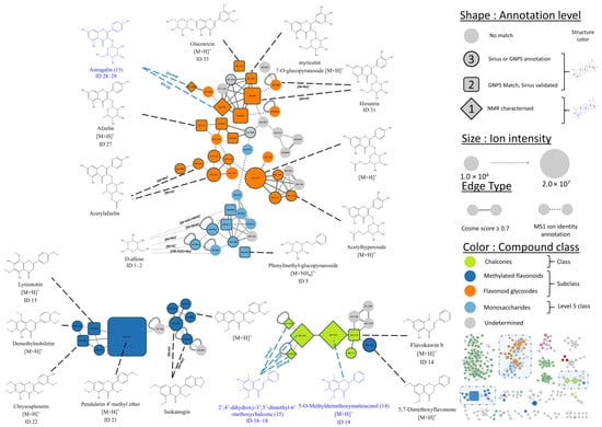 Free and glycosylated flavonoids were reported in previous plant investigations. For instance, kaempferol and quercetin, both free or linked to an unspecified sugar, were previously detected by HR-MS/MS analyses [4,6]. In the present cluster, one feature was identified as quercetin (ID 11, Table S1), one as kaempferol (ID 8), and three features as glycosylated kaempferol (ID 25, 27, and 28). Sugar of compound 13 was identified later by NMR as glucose.