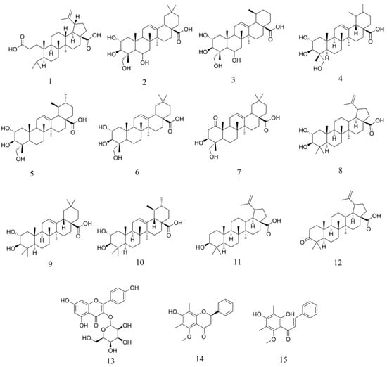 Fifteen compounds were identified through the purification strategy (Figure 4). The compounds 2–15 were known and characterized by comparison of their 13C and 1H NMR chemical shifts with literature references. A comparison table (Table S2) is available in the supplementary information, as well as all NMR analysis. Appendix A provides further details on yields and physical properties. Compounds 2 and 3 (namely terminolic acid and madecassic acid) and compounds 5 and 6 (namely asiatic acid and arjulonic acid) are in 1:1 mixtures, which could be characterized. All other compounds were retrieved pure. Compounds 13 (astragalin) and 14 (5-O-methyldemethoxymatteucinol) belong to the flavonoid family. Compound 15 (2′,4′-dihydroxy-3′,5′-dimethyl-6′-methoxychalcone) is a chalcone. Compounds 2–12 are triterpenes from lupane, oleanane, and ursane subfamilies. Compounds 5 and 10 were previously isolated and characterized in the plant species [5]. Compound 13 has been previously reported with HRMS data but never isolated in the plant [4]. All other 12 compounds (1–4, 6–9, and 11–15) have never been reported in P. mauritianum.