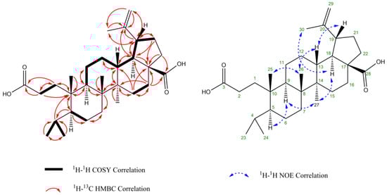 Chemical shifts of compound 1 have never been described in the literature. The HRESIMS analysis gave a molecular formula of C30H48O4 (m/z = 495.3447 [M+Na]+, calculated 495.3445), suggesting a triterpene structure. The 1H NMR spectrum enabled to show six methyl groups. The signal of diastereotopic methylene protons at δ1H 4.60 ppm and δ1H 4.72 ppm (diastereotopicity verified by edited HSQC) and the methyl group at δ1H 1.70 ppm are typical of isopropenyl moiety of a lupane triterpene. Moreover, compound 1 has many signals in common with compound 12 (betulinic acid, molecular formula C30H46O3). However, the C-3 signal at δ13C 221.0 ppm (corresponding to a ketone) present in compound 12 is not found in compound 1. Instead, a shielded signal at δ13C 179.2 ppm suggesting a carboxylic acid function is observed in compound 1 and not in compound 12. Presumably, compound 1 is an oxidized analog of compound 12, where the ketone in C-3 has been replaced by a carboxylic group with a ring opening. Furthermore, the signal of the protons of two methyl groups C-23, C-24 in compound 1 appeared as two duplets, whereas all methyl group signals in compound 12 show singlet signals. These two methyls at δ1H 0.92 and 0.81 ppm, respectively, correlate in HMBC spectrum with a carbone at δ13C 26.5 ppm and couple with the same unique proton at δ1H 1.92 ppm in COSY spectrum. Thus, it can be supposed that these two methyl groups are in positions 23 and 24, connected to the tertiary carbone C4. This validates the hypothesis the C3–C4 bond has been severed. Finally, the structure of compound 1 (Figure 5) has been unambiguously identified by extensive 1D and 2D NMR (COSY, HSQC, HMBC, and NOESY) analyses as (3S,4S,5R,8R,9R,10R,13S,14R,15R)-4-(2-carboxyethyl)-3-isopropyl-4,9,10-trimethyl-15-(prop-1-en-2yl)hexadecahydro-13H-cyclopenta[a]phenanthrene-13-carboxylic acid, named psiloxylic acid. The nine stereocenters have also been determined through NOE correlation. NMR data are reported in Table 1. Finally, the optical rotation was measured: = + 15.5 (c = 0.3257 g/100 mL, MeOH).