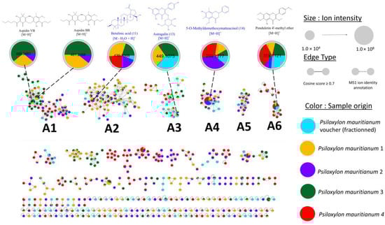 The chemical composition of the P. mauritianum voucher specimen is in accordance with previous reported studies. However, phloroglucinols (namely aspidin VB and aspidin BB) [5], usually reported in the different published phytochemical investigation of the plant extracts, were missing. As these compounds have been reported to have potent antibacterial activity, which is one of the purposes of the traditional use of this plant species, we wanted to investigate if the extract chemical composition may vary according to the sample location. Four other specimens of P. mauritianum morphologically similar to the voucher specimen were collected at a different location (Basse Vallée, 25 km from the voucher’s site) on the same day and were all found within a radius of 10 m. The samples were prepared and analysed as previously, following the same extraction protocol and the same metabolomic profiling by UPLC-HRMS/MS to enable a proper comparison with the voucher specimen. To this end, MS2 data were analysed through a newly generated IIMN (Figure 6) to display the metabolomic differences between the different P. mauritianum specimens.