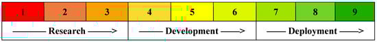 Technology readiness level is a qualitative criterion that reflects the maturity of a given technology on a nine-point scale (1–9). A higher number indicates greater maturity and readiness for commercialization. The following color-coded chart depicts the TRL scale as technologies advance from research to development (R&D) to deployment (Figure 1).