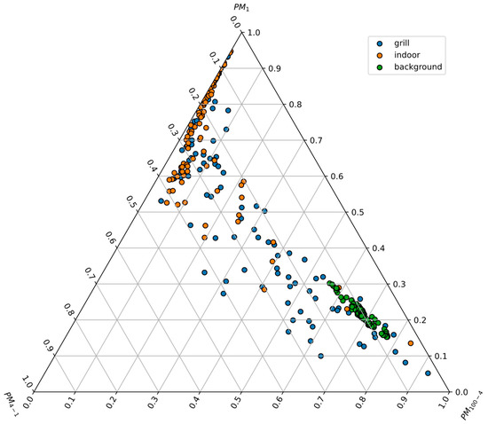 With regard to the background environment, as illustrated by the green data points in Figure 3, it is predominantly characterised by PM100−4 particles, as evidenced by the clustering along the right side of the plot. This pattern is to be expected in ambient outdoor air, where larger particles such as dust and pollen are prevalent [70,71]. The low concentration of PM1 comprises 10 to 30% of the dust mass, and the PM4−1 fraction accounts for only 10 to 20%. Therefore, it can be concluded that the mass of the PM4−1 fraction did not exceed 50% of the PM mass. Similarly, the trend associated with the PM4−1 fraction in grilling (blue dots) was maintained; however, the limit of the maximum content of this fraction increased to 40% of the PM. Overall, the results demonstrate that the grilling process itself, using a grill without emission fuel, can be a significant factor affecting the contribution of submicron PM.