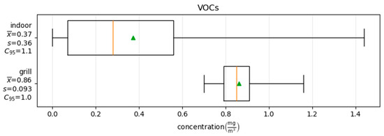 Boxplots of the VOC sum during grilling with values of means, standard deviation, and 95th percentile. The boxes are from the 1st to 3rd quartile, the orange line denotes the median, while the green triangle is the position of the mean. Whiskers are from the minimum to maximum. The concentrations between sites were significantly different (Brunner Munzel test [78], p < 0.001).