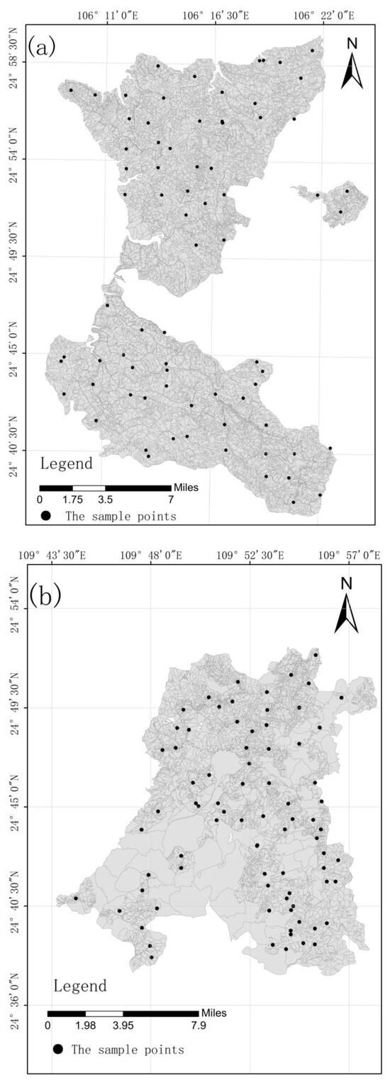 Distribution of sampling points in the study area. (a) is Yachang Forest Farm. (b) is Huangmian Forest Farm.