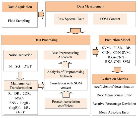 The Pearson correlation coefficient was used to preliminary screen the preprocessing combinations that were more effective in extracting spectral data features. Seven modeling methods were then selected for modeling: Support Vector Machine (SVM), Partial Least Squares Regression (PLSR), Backpropagation Neural Network (BP), Convolutional Neural Network (CNN), CNN-SVM, CNN network improved by the Black-winged Kite Algorithm (BKA-CNN), and CNN-SVM network improved by the Black-winged Kite Algorithm (BKA-CNN-SVM). The optimal preprocessing combination and the best modeling method were selected. The methodological flow of this study is shown in Figure 2.