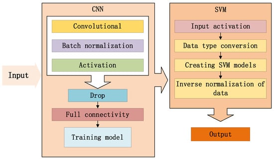 The CNN-SVM approach combines the strengths of deep learning and machine learning [44]. CNN acts as feature extractors, learning high-level feature representations from spectral data, which are then classified by SVMs. The overall workflow is illustrated in Figure 3. SVMs offer excellent generalization and robustness, effectively handling high-dimensional feature spaces with numerous spectral bands. This approach avoids the excessive parameters and overfitting issues associated with traditional CNN fully connected layers. For spectral data, CNN can extract features from both global and local regions through convolution operations, preserving the spatial structure of spectral bands. SVM kernel functions then map these features to high-dimensional spaces, capturing nonlinear relationships more effectively and simplifying computations in the original feature space.