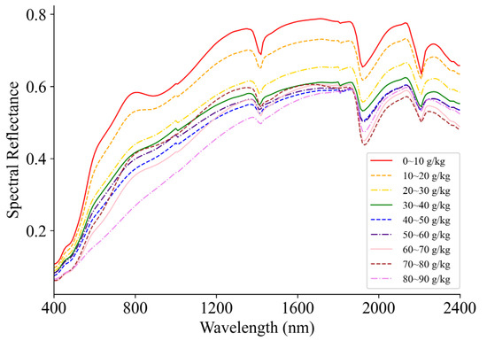 The spectral reflectance corresponding to different organic matter contents measured in this study is shown in Figure 5. The overall reflectance trends for different SOM contents are generally similar, with reflectance inversely related to SOM content. In the 400–800 nm visible light range, SOM exhibits strong absorption, while in the 800–2400 nm near-infrared range, SOM shows strong reflectance. An absorption valley influenced by iron oxide appears at a wavelength of 950 nm, and absorption valleys influenced by moisture appear at wavelengths of 1500 nm, 1900 nm, and 2350 nm.