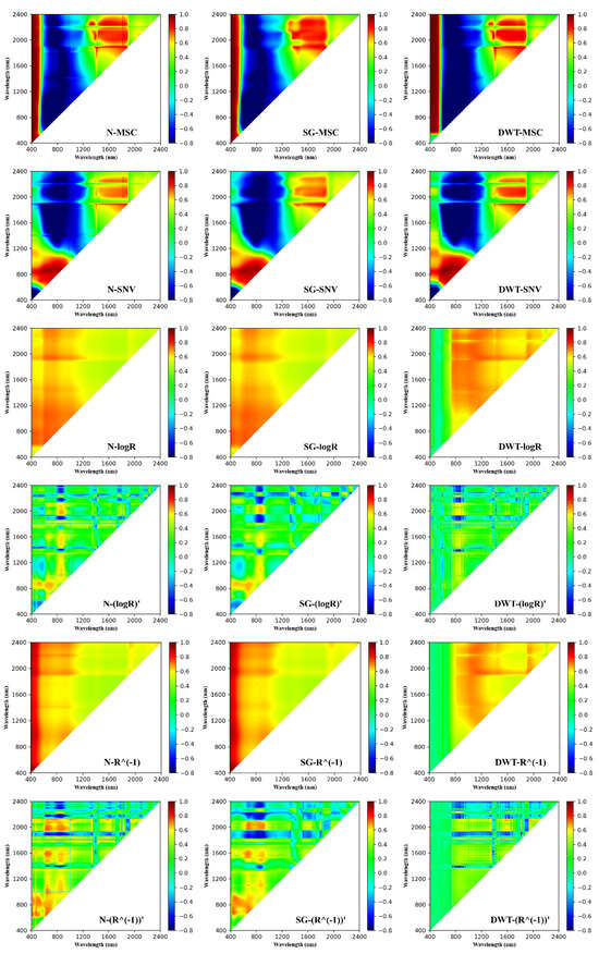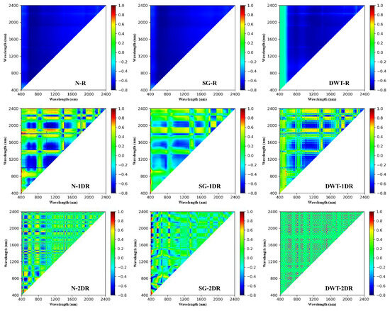 Correlation analysis is a statistical method used to explore the degree of association between two or more variables [52]. The Pearson correlation coefficient, as an indicator of correlation analysis, reflects the relationship between adjacent spectral bands and soil organic matter (SOM) content. Based on this, a correlation heatmap is constructed to reveal the relationship and degree of influence between band reflectance and SOM content under different preprocessing methods. Using the data preprocessed according to the combinations in Table 3, a Pearson correlation coefficient heatmap of spectral band reflectance and SOM content is shown in Figure 6. In the heatmap, Pearson correlation coefficients are represented by different colors. The heatmaps for the mathematical transformations R, logR, and 1/R show relatively uniform correlation changes. In contrast, MSC and SNV exhibit diverse correlation changes, but their color distribution is concentrated, indicating less noticeable changes in individual spectral data. Observations reveal that the heatmaps for the four mathematical transformations 1DR, 2DR, (LogR)’, and (1/R)’ show more diverse correlation changes and more uniform color distribution. Data based on these four transformations effectively present the correlation characteristics between spectral band reflectance and SOM content, providing valuable insights for subsequent modeling.