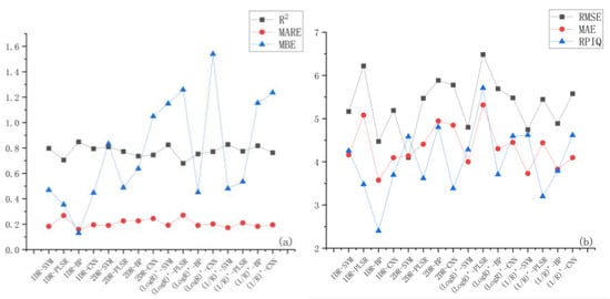 R2, RMSE, MAE, MARE, and MBE are widely used evaluation metrics in the fields of soil spectral data prediction and artificial intelligence [45]. R2 reflects the correlation between the actual soil SOM content and the model’s predicted values. The closer R2 is to 1, the higher the model’s accuracy, as shown in Equation (16). RMSE indicates the deviation between the actual soil SOM content and the model’s predicted values. It is negatively correlated with model stability, as shown in Equation (17). MAE measures the accuracy of the predictive model. The smaller the MAE, the higher the model’s accuracy, as shown in Equation (18). MBE measures the tendency to overestimate or underestimate parameter values. A positive bias means the error is overestimated, while a negative bias means the error is underestimated. This metric quantifies overall bias and captures the average deviation in predictions, as shown in Equation (19). MARE measures the degree of deviation between the predicted and actual values by calculating the relative error between them and taking the average of their absolute values, as shown in Equation (20).