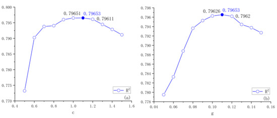 SVM parameter optimization process. (a) shows the optimization situation of parameter c. (b) shows the optimization situation of parameter g.