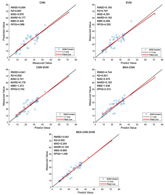 To validate the effectiveness of the model optimization results, we uniformly used the training and test samples obtained through SG-1DR preprocessing as divided in Table 2. This study selected five modeling methods—CNN, SVM, CNN-SVM, BKA-CNN, and BKA-CNN-SVM—to compare the prediction accuracy of SOM content. The modeling results are shown in Table 7. To visually understand the differences between the predicted and actual values for each model, regression scatter plots of the predicted and actual values for each model’s test set were drawn, as shown in Figure 10. The closer the fitted regression line is to the 1:1 line, the more accurate the model’s predictions. The BKA-CNN-SVM model was the best in all four evaluation metrics, with its scatter points more evenly distributed around the 1:1 line. The RMSE of the validation set was 3.042, which decreased by 2.022, 2.123, 1.599, and 1.702 compared to other models. The R2 was 0.930, which increased by 12.3%, 13.3%, 9.2%, and 9.9% compared to other models. The MAE was 2.254, which decreased by 1.716, 2.137, 1.487, and 1.221 compared to other models. The MARE was 0.1, which decreased by 0.077, 0.083, 0.078, and 0.063 compared to other models. The RPIQ was 1.436, which decreased by 3.560, 2.819, 2.316, and 0.876 compared to other models. It can be seen that the BKA-CNN-SVM model has a high degree of matching between predicted and actual values, indicating that the addition of SVM improves the generalization ability of regression predictions. The Black-winged Kite Algorithm significantly enhances the accuracy of the CNN-SVM network, showing a more significant and positive impact on the effective management of forest soil in the study area and enhancing the scientific and practical effectiveness of soil improvement strategies.