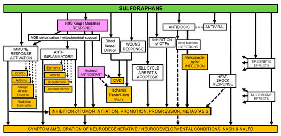 The many mechanisms (not colored) of action of sulforaphane and some of the the diseases or conditions in which effects of sulforaphane have been examined experimentally (orange); magenta shading for emphasis of mode of action most targeted by clinical studies. (adapted from []).