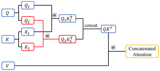 To enhance the diversity of input data features, we propose optimizing the neural network’s feature perception through a split-and-concatenate method. This approach increases the informational richness of the self-attention mechanism by introducing additional flexibility and granularity in the representation of intermediate variables. The detailed process of the proposed CA method is shown in Figure 2. After generating the three core matrices Q, K, and V, the Q and K matrices are first equally split along the same dimension, ensuring that the resulting submatrices are of equal size. This guarantees that the dimensions of the subsequent result matrices will also remain consistent. This splitting operation introduces variability into the computation process, as the submatrices not only focus on different parts of the data’s feature space but also enable fine-tuning when computing .
