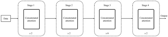 The modified neural network architecture incorporates the proposed CA method, as shown in Figure 3. The network consists of four stages, each containing a specific number of layers required for training. The layers in each stage are trained repeatedly, with repetition counts of 2, 2, 6, and 2, as indicated below the figure. The structures of different stages vary to accommodate the diversity and complexity of features at different levels. The design of repetition within the same stage balances the number of parameters trained and the final accuracy. Additionally, the consistency within each stage simplifies parameter sharing and reduces redundancy, thereby improving computational efficiency. Similarly, the size of the core matrices applied in the CA method varies across stages, dynamically adjusting to the resolution and complexity of the input data at each level.