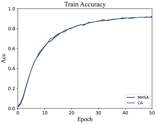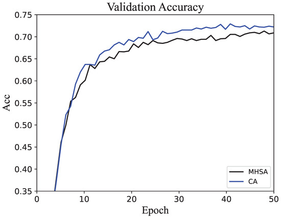 To intuitively illustrate the differences between the two methods during training, a line chart was created to show accuracy variations across epochs. The accuracy trends on the training set for both methods are depicted in Figure 4, where the curves exhibit nearly identical trends. This consistency suggests that the proposed method does not disrupt the network’s ability to effectively adjust parameters during training, even when the training set size is small. This is because the training set contains significantly more data than the other subsets, allowing the network parameters to be adequately adjusted. The accuracy trends on the validation set are shown in Figure 5, revealing that the proposed method achieves noticeably higher accuracy than the original method after approximately 10 epochs. The similarity in accuracy trends between the CA and MHSA methods on the training set indicates that both methods are equally capable of fitting the training data. This suggests that the core improvements introduced by the CA method do not negatively affect the network’s ability to learn from the available training data. However, the noticeable differences on the validation set, with the CA method achieving faster and higher accuracy improvements, demonstrate its enhanced generalization capabilities. This can be attributed to the CA method’s ability to extract more diverse and informative features through its split-and-concatenate mechanism. By enriching the representation of intermediate variables and dynamically weighting their contributions, the CA method effectively captures more critical patterns and relationships in the data that are relevant for unseen validation samples. In contrast, the MHSA method may focus more on fitting the training data without adequately capturing the broader feature diversity, leading to a slower improvement in validation accuracy. The superior performance of the CA method on the validation set highlights its robustness and adaptability, making it better suited for handling complex and diverse real-world data distributions.