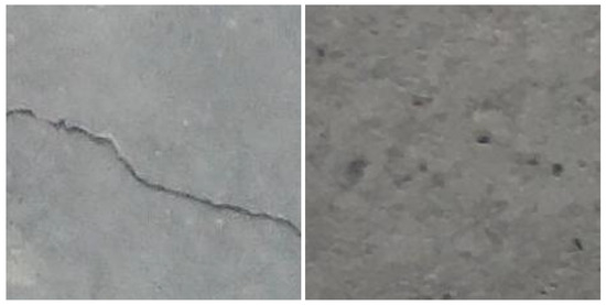 The dataset applied in this section consists of binary classification data captured by sensors under varying environmental conditions [35]. One class represents surfaces with cracks, while the other class represents intact surfaces. Two sample images from the dataset are shown in Figure 8, where the left image shows a cracked surface, and the right image shows a flawless surface. Notably, the intact surface image highlights one of the key challenges in this task: even pristine surfaces may exhibit stains, water marks, or other environmental artifacts that resemble cracks, complicating the classification process. It is evident that even intact surfaces may have stains or other attachments, which can lead to misclassification, particularly in low-light underwater environments. Additionally, varying illumination levels and sensor noise in these environments exacerbate the difficulty, further stressing the need for robust feature extraction and classification mechanisms.