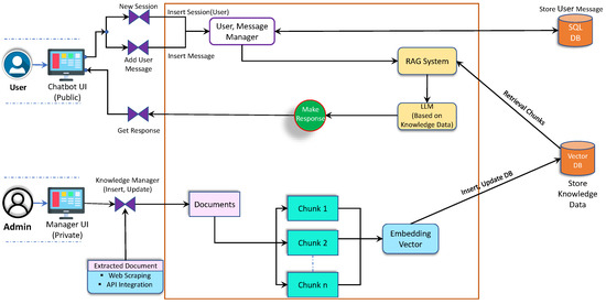 Following validation, the data are segmented into smaller chunks and converted into vector embeddings using a dedicated embedding service. These embeddings are stored in the vector database, enabling fast and efficient similarity-based retrieval. When a user submits a query, the system retrieves relevant chunks by comparing the query embedding with stored embeddings in the vector database [27,28]. The retrieved information is then combined with the internal knowledge of a pre-trained large language model (LLM) to generate accurate and contextually appropriate responses. To further improve reliability and address potential gaps, the system incorporates a feedback loop. User interactions are logged, and flagged responses are analyzed to identify inconsistencies or errors in the knowledge base. This feedback is processed through the Admin Interface, enabling administrators to make targeted updates and refinements. This iterative process ensures continuous improvement in response quality and system reliability.