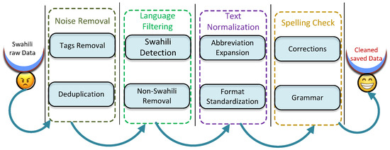A key feature of the system is the automatic preprocessing workflow, which streamlines the preparation of raw Swahili data for integration into the knowledge base. This workflow, illustrated in Figure 2, is implemented using Python scripts tailored to the unique characteristics of the Swahili language. The automated process reduces manual workload while ensuring the data meet quality standards. The preprocessing begins with noise removal, where irrelevant characters, symbols, and HTML tags are filtered out to retain only meaningful content. A language detection algorithm then identifies and removes non-Swahili text, ensuring that the dataset remains focused on Swahili content. Abbreviations and shorthand terms are expanded into their full forms to improve clarity and readability. Text normalization ensures consistency in punctuation, casing, and spacing while harmonizing spelling variations. Grammar and spelling corrections are applied using predefined Swahili linguistic rules to enhance the text’s linguistic accuracy. Finally, duplicate entries are detected and removed to avoid redundancy and optimize storage efficiency. These automated steps are critical for preparing high-quality data while minimizing manual intervention.