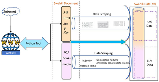 Figure 4 illustrates the workflow for data collection and preparation, which is essential for creating a reliable and organized knowledge database for Swahili Natural Language Processing (NLP) tasks. The database is generated through a systematic pipeline that combines automated tools, manual verification, and structured organization. The process begins by identifying dependable data sources, such as websites, FAQ sections, books, and media content. These sources provide diverse Swahili language data, ensuring comprehensive coverage of both general and specialized topics [33].