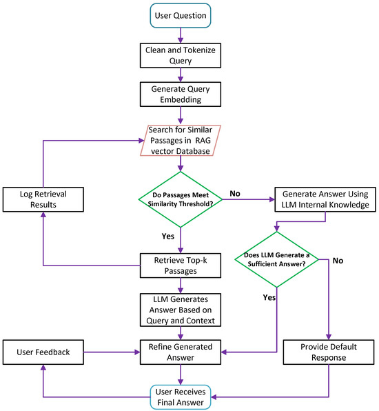 The LLM generates an answer by combining the retrieved contextual information (if available) with its internal knowledge. If the generated answer meets quality standards ensuring it is relevant, coherent, and grammatically accurate it is refined further and delivered to the user. However, if the LLM fails to generate a sufficient answer, the workflow provides a default response to ensure user engagement is maintained. The system also incorporates a feedback mechanism, allowing users to provide input on the response quality. This feedback is logged and used to iteratively improve both retrieval and generative components of the system, enhancing its overall accuracy and reliability over time.