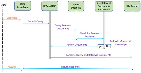 Figure 8 illustrates the interaction workflow between the user, the Retrieval-Augmented Generation (RAG) system, the vector database, and the large language model (LLM). This workflow highlights the sequence of operations that enable the system to process user queries and deliver accurate responses.