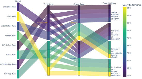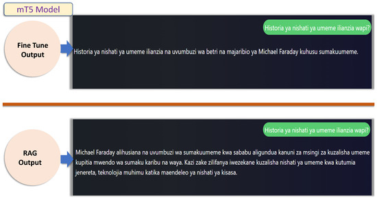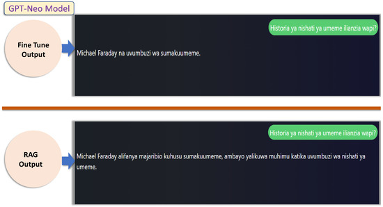 The GPT-Neo model was evaluated on its ability to generate responses for Swahili queries under both Fine-Tune and Retrieval-Augmented Generation (RAG) conditions. Table 15 provides an example of a Swahili question and its English translation, along with the corresponding responses generated by the GPT-Neo model under both approaches. While the RAG method improved response quality compared to the Fine-Tune approach, GPT-Neo’s outputs remained less detailed and comprehensive than those generated by the mT5 model but showed noticeable improvement over GPT-2. For instance, the Fine-Tune response for GPT-Neo briefly mentioned Michael Faraday and electromagnetism, whereas the RAG response expanded on this by describing Faraday’s experiments and their significance in the discovery of electricity.