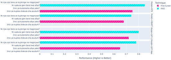 Figure 22 further illustrates the comparative performance, demonstrating that RAG enables GPT-Neo to generate more contextually relevant and informative responses compared to Fine-Tune. However, the model still lacks the depth and nuance observed in the outputs of mT5, particularly when addressing complex and detailed queries. These results suggest that while GPT-Neo benefits significantly from the RAG framework, it remains a less robust option than mT5 for tasks requiring high levels of accuracy and contextual understanding in Swahili language processing.