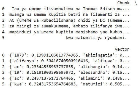 Figure 5 illustrates the embedding and vector representation process, which is a foundational component of the Retrieval-Augmented Generation (RAG) framework for Swahili conversational systems. This process transforms chunks of text into mathematical representations, called vectors, which the system uses to retrieve relevant information and generate accurate responses. The process begins with the input data, which could be a user query, a Swahili document, or any text-based information. The input is divided into smaller sections, known as chunks, to make processing more efficient. Each chunk typically contains 100–200 words, ensuring a balance between capturing meaningful information and maintaining computational efficiency. These chunks are then passed through an embedding model, such as Sentence-BERT (SBERT) or multilingual BERT (mBERT), which generates dense vector representations [35]. These vectors encapsulate the semantic meaning and contextual relationships within the text, enabling precise comparisons in the vector space.