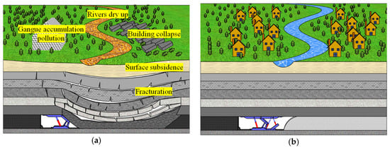 Differences in environmental damage between the caving method and the filling method: (a) caving method; (b) filling method.