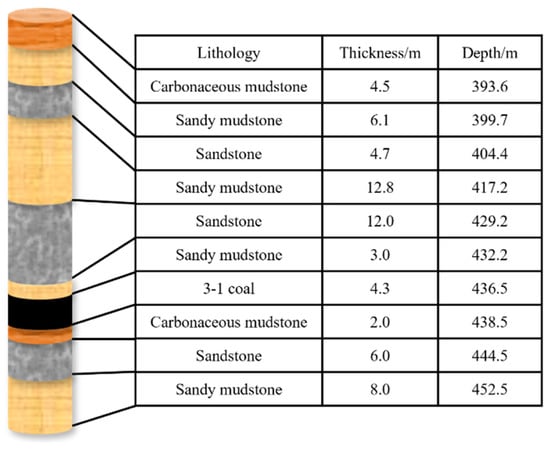 The Chahasu Coal Mine is located in the southwestern region of Dongsheng District, Ordos City, Inner Mongolia. It primarily mines the 3-1 coal seam, which has an average burial depth of 436.5 m, an average dip angle of 2°, and an average thickness of 4.3 m. The geological structure of the mine is relatively simple, with the stratigraphic column shown in Figure 2.