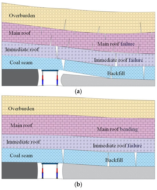 - When the backfill ratio is low, the open void distance in gob and the roof subsidence space are large. As the working face advances, the support provided by the backfill material is limited. The immediate roof and main roof successively fracture and collapse, causing intense manifestations of mining stress. This results in severe deformation of the gob-side entry, leading to ground subsidence and limited protection for the surface environment, buildings, and water systems. The movement characteristics of overlying strata under low backfill ratios are illustrated in Figure 4a.