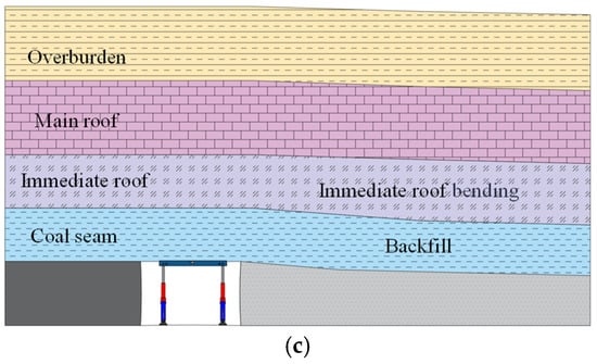- As the backfill ratio continues to increase, the open void distance and roof subsidence space in gob become extremely limited. The backfill material effectively restricts the subsidence of both the immediate roof and main roof, preventing them from fracturing. The movement characteristics of overlying strata are dominated by bending and subsidence without the formation of fractures or collapse zones. This results in excellent stability of the gob-side entry and significantly contributes to the protection of the surface ecological environment. The movement characteristics of overlying strata under high backfill ratios are illustrated in Figure 4c.