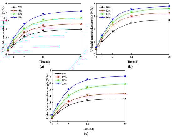 Age strength of filling materials at different ratios: (a) mass concentration; (b) fly ash proportion; (c) cementitious material proportion.