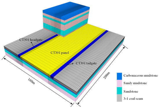 As shown in Figure 6, a FLAC3D numerical model was established based on the geological conditions of the CT301 panel at Chahasu Coal Mine. The model dimensions are 160 m × 200 m × 63.4 m. Displacement constraints were applied to the bottom and surrounding boundaries of the model, and a uniformly distributed load of 10 MPa was applied to the upper boundary.