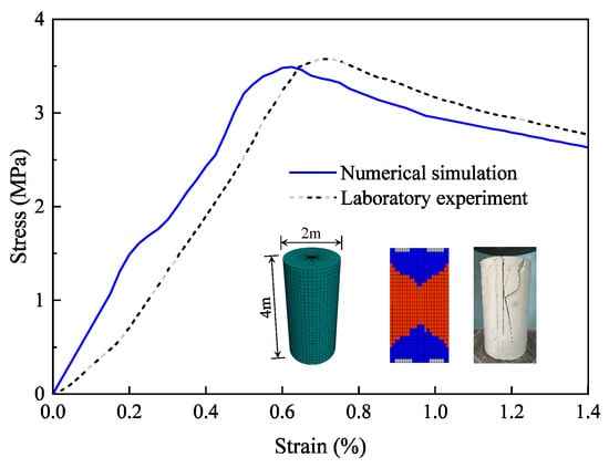To obtain accurate parameters for the Strain-Softening model, a submodel method was employed for parameter calibration. A cylindrical model with a radius of 1 m and a height of 4 m was established in FLAC3D. A uniaxial compression test was performed using a strain-loading method with a loading rate of 2.5 × 10−5 m/step. Through a trial-and-error process, the internal friction angle and cohesion were adjusted until the stress-strain curve obtained from the numerical simulation closely matched the laboratory test results. The inverse calculation yielded the mechanical parameters for CPB material in the FLAC3D model. When the stress-strain curve from the numerical simulation showed good agreement with the experimental data, it confirmed that the calibrated parameters could be used to simulate the Strain-Softening model. The final Strain-Softening model mechanical parameters are shown in Table 2 and Table 3, with the calibration results presented in Figure 7.