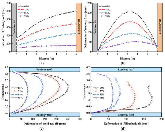From Figure 8a, it can be seen that under different backfill ratios, the roof subsidence of the roadway follows an asymmetric pattern. The subsidence near the solid coal side is smaller than that near the backfill side, with the subsidence increasing as the distance to the backfill side decreases. At a backfill ratio of 65%, the maximum subsidence of the roof is 1010 mm, and the displacement difference between the two sides of the roof is approximately 683 mm. At a backfill ratio of 75%, the maximum subsidence of the roof is 692 mm, and the displacement difference between the two sides of the roof is about 441 mm. At a backfill ratio of 85%, the maximum subsidence of the roof is 451 mm, and the displacement difference between the two sides of the roof is around 296 mm. At a backfill ratio of 95%, the maximum subsidence of the roof is 157 mm, and the displacement difference between the two sides of the roof is about 70 mm. As the backfill ratio increases, the maximum subsidence of the roof decreases, and the displacement difference between the two sides of the roof reduces, indicating an improvement in roof deformation uniformity.