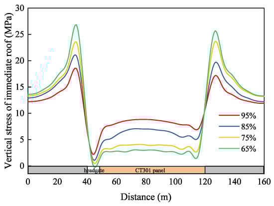 From Figure 9, it can be seen that the vertical stress of the immediate roof above the GER roadway decreases sharply. At backfill ratios of 95%, 85%, 75%, and 65%, the minimum vertical stresses are 0.17, 0.75, 1.23, and 2.19 MPa, respectively. As the backfill ratio increases, the minimum vertical stress on the immediate roof above the roadway increases. The vertical stress on the immediate roof above the filled working face increases as the backfill ratio increases, and the stress distribution is generally smoother, with stress values stabilizing at approximately 8.80, 6.99, 4.03, and 2.96 MPa for backfill ratios of 95%, 85%, 75%, and 65%, respectively. Stress concentration occurs on the coal rib sides of roadway, with the peak vertical stress on the immediate roof above the coal rib sides at backfill ratios of 95%, 85%, 75%, and 65% being 18.4, 20.8, 23.4, and 26.7 MPa, respectively. The peak stress decreases as the backfill ratio increases. This indicates that as the backfill ratio increases, the backfill material can support the overlying rock layers more quickly and effectively, with the supporting effect on the roof becoming more pronounced. This enhances the ability of the backfill material to bear the load of the overlying rock layers, thus further reducing the mining-induced stress.