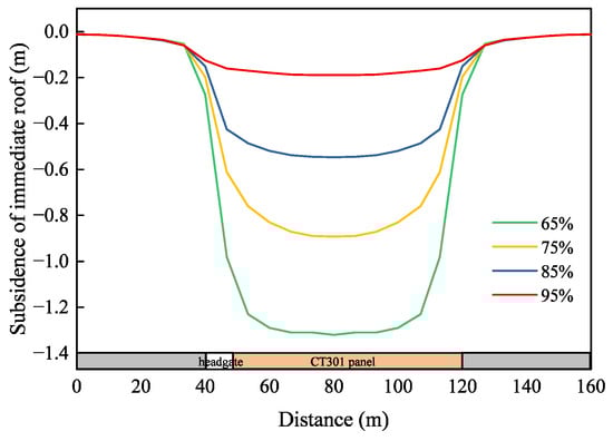 From Figure 10, it can be observed that the subsidence of the immediate roof decreases as the backfill ratio increases. At backfill ratios of 95%, 85%, 75%, and 65%, the maximum roof subsidence is 189, 438, 898, and 1360 mm, respectively. When the backfill ratio decreases from 95% to 85%, the reduction in maximum roof subsidence is relatively small. At this stage, the overlying rock layer only experiences bending subsidence and cracking. When the backfill ratio decreases from 85% to 65%, the supporting effect of the backfill material significantly decreases, and the space for the roof rotation increases, causing more intense mining-induced stress. The maximum roof subsidence increases from 438 mm to 1360 mm, and at this stage, the immediate roof and the main roof fracture, with a significant increase in roof subsidence and poor surrounding rock stability.