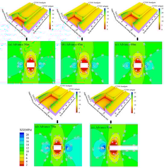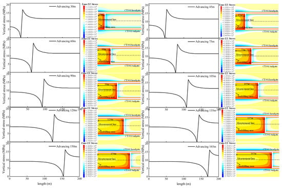 Under the condition of a 95% backfill ratio, a monitoring station is arranged 90 m away from the open-off cut of CT301 panel to observe the distribution of abutment stress in the mining area at working face advance distances of 30, 45, 60, 75, 90, 105, 120, 135, 150, and 165 m, as well as the stress distribution of roadway surrounding rock during the extraction process (Figure 11). In the following description, “–” represents that the working face has not yet passed the monitoring station, while “+” indicates that the working face has passed the monitoring station.