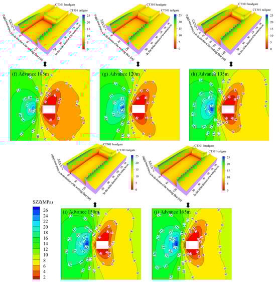 Evolution law of abutment stress in different advancing distances of the mining site: (a) advance 30 m; (b) advance 45 m; (c) advance 60 m; (d) advance 75 m; (e) advance 90 m; (f) advance 105 m; (g) advance 120 m; (h) advance 135 m; (i) advance 150 m; (j) advance 165 m.