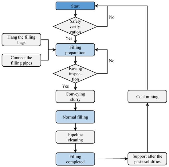 During construction, the slurry is transported to the underground filling working face via a filling pump, where it is used to fill the mined-out area created by coal extraction. The working face follows a standard cycle from filling to coal mining, which includes the following steps: coal mining → preparation of filling slurry → production preparation → coal mining. Filling begins after coal extraction in the workface. The filling area is prepared, and isolation walls are installed at both ends of the workface. Filling bags are hoisted, and piping is connected. Once everything is in place, the filling station is notified by the filling area supervisor to start the filling process. The construction sequence is shown in Figure 13. After the filling is completed, the working face support cannot be moved until the slurry has solidified in the filling area, at which point the support can be moved and coal extraction can resume.